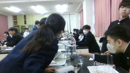 下:1年1組 理科     赤ワインの蒸留の実験をしています。