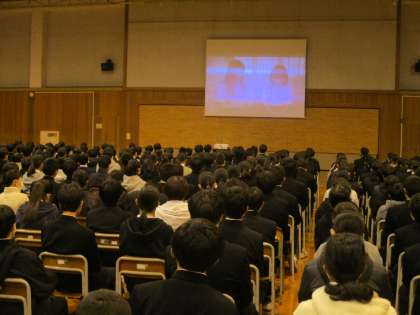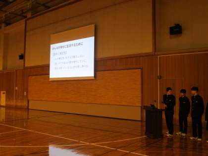 人権集会では、奥中生一人一人が幸せな生活を送れるよう、生徒会執行部が「奥中人権宣言」を提案しました。その後、いじめに関するビデオを見て、感想を書きました。
