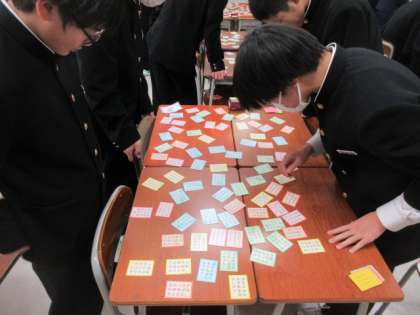 百人一首のゲームを行いました。先生が読み上げた「上の句」を聴き、素早く「下の句」のカードを取っていました。覚えていたカードを相手に取られて悔しがる姿も見られました。