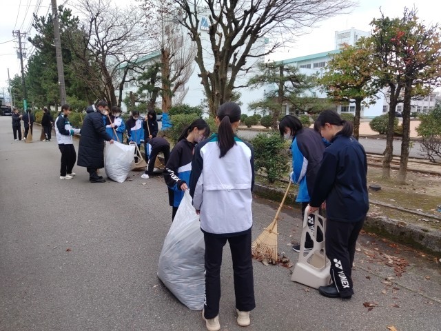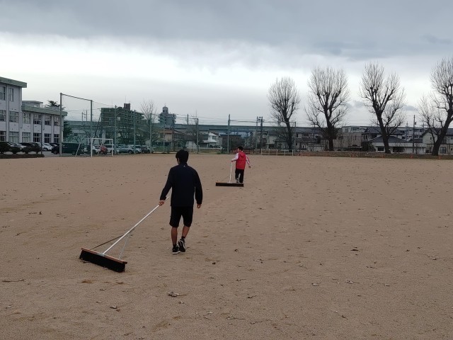 1月6日(月) 午前の部活動 公開日 2025/01/06 更新日 2025/01/06 部活動 令和7年最初の部活動の様子を紹介します。写真:上 練習を終えて校地周辺の清掃活動を行うバドミントン部 :中 打撃練習中の野球部 :下 活動終了後、グラウンドの整地をする陸上競技部