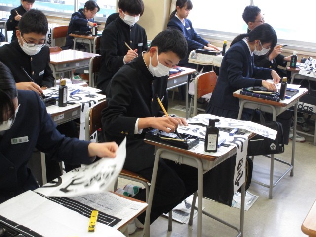 2年生の題目は「富山の薬」。筆の流れと行書らしい字の形に気を付けながら書きました。