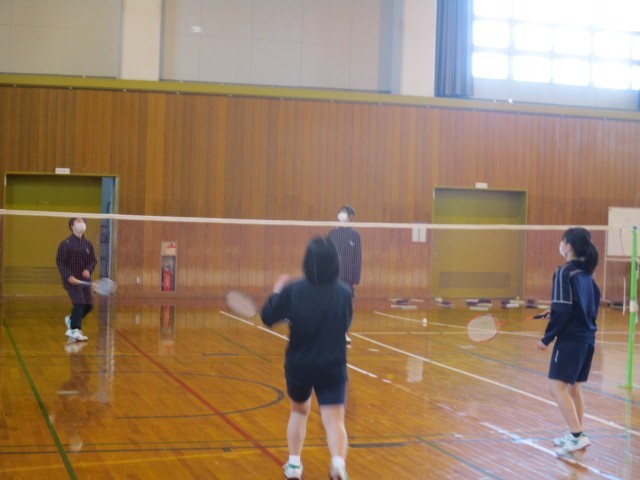4組(保体):バドミントンの技術向上に向けて、時間を決めてラリーをしています。