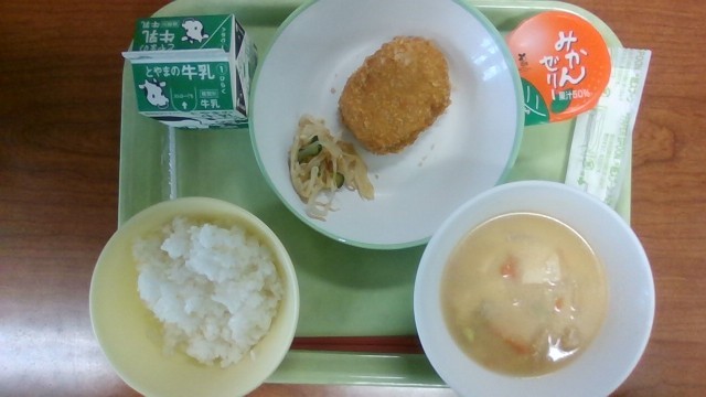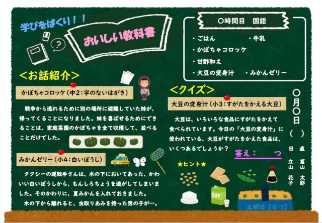 1月31日(金) 給食の時間 公開日 2025/01/31 更新日 2025/01/31 1学年 今週の給食、「時間割シリーズ」、最終日の教科は「国語」です。「すがたをかえる大豆」(大豆を原料とした食材が6種類含まれていました!)(小学校3年生の学習です。)「白いぼうし」(みかんゼリー、小学校4年生で学習します。)「字のないはがき」(かぼちゃコロッケ、中学校2年生で学習します。)