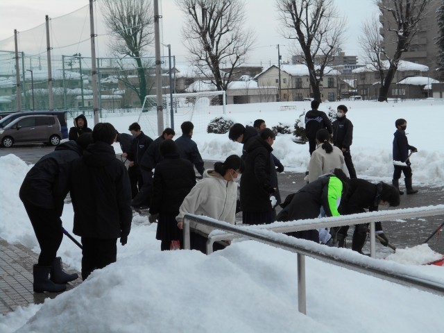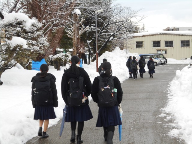 2月10日(月) 登校風景 公開日 2025/02/10 更新日 2025/02/10 学校だより 冬型の気圧配置も少し緩み、大雪のピークも過ぎたようです。今朝もたくさんの生徒が除雪に協力してくれました。週の半ばには気温の高い日も出てきそうです。登下校時には屋根からの落雪等に注意してください。今日は県立高校推薦選抜入試です。