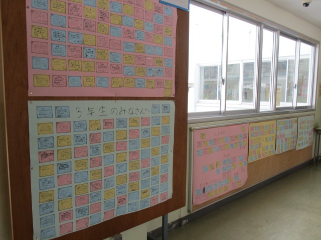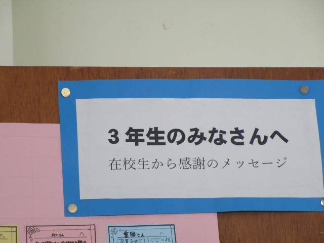 生徒玄関のフェイスボードには、1・2年生から3年生への感謝のメッセージ「3年生のみなさんへ」が掲示されています。部活動や行事等でお世話になったことや、3年生から学んだことへの感謝の気持ちが伝わってきます。