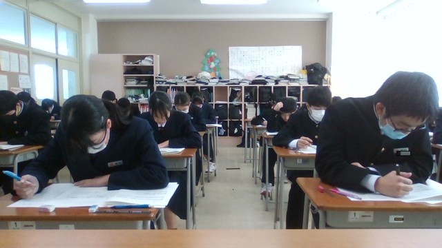写真は3限目の「音楽」のリスニング問題に聴き入る様子です。