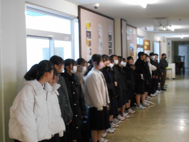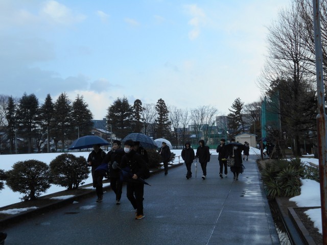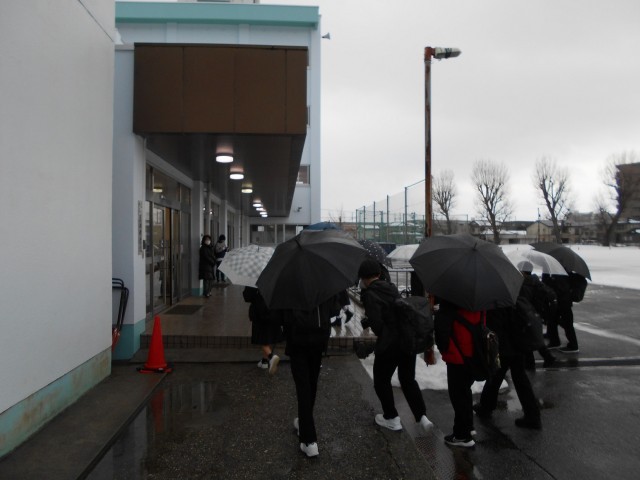 2月26日(水) 登校風景 公開日 2025/02/26 更新日 2025/02/26 学校だより 雨の朝です。雪解けが一気に進みます。グラウンドはまだ一面の雪ですが、来週から3月。グラウンドでの活動もそろそろです。今朝は吹奏楽部の皆さんが挨拶運動を行いました。1,2年生は学年末考査2日目です。