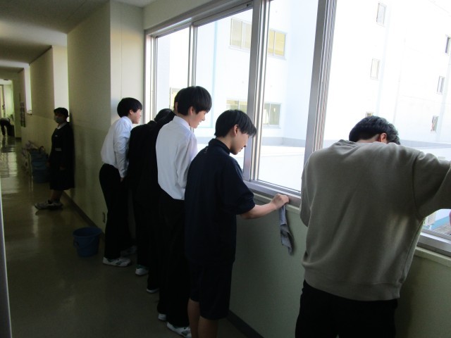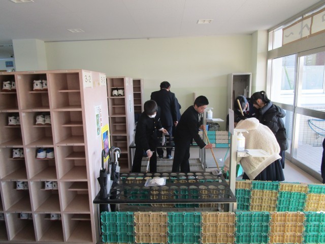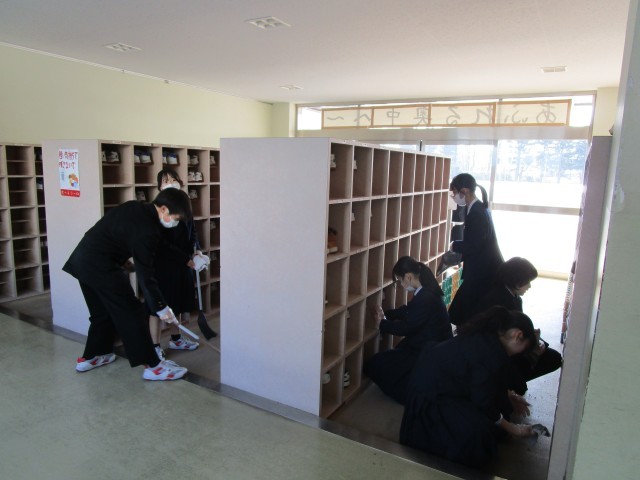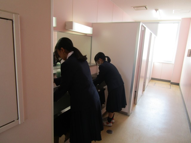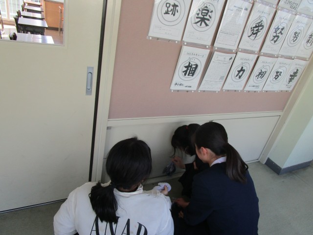 2月27日(木)3年生への恩返し大作戦 公開日 2025/02/27 更新日 2025/02/27 生徒会 放課後に、環境委員会企画の「3年生への恩返し大作戦」を実施しました。 学年末考査を終えた1・2年生の環境委員とボランティアの生徒が、生徒玄関やトイレ、そして3年教室前を掃除しました。冷たい水で雑巾を洗い、一生懸命に廊下や洗面所を磨き、隅々までピカピカにしてくれました! 3年生の皆さん、明日、楽しみに登校して下さい!1・2年生の皆さん、ありがとう! +4