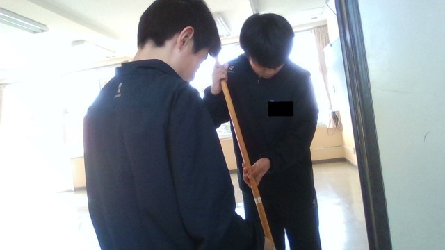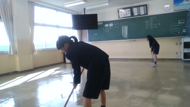 1学年教室では全生徒が磨き上げた床に環境委員とボランティアの生徒がワックスがけを行いました。