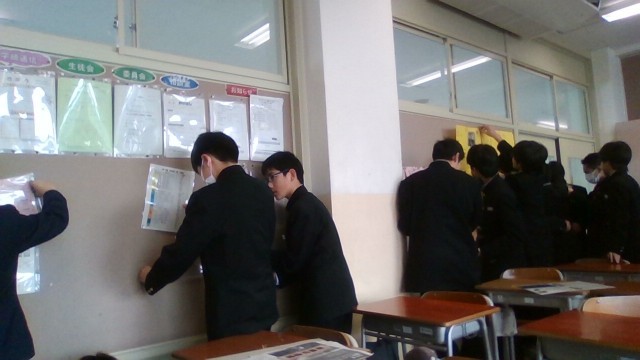 教室内外の掲示物をはずしたり、机・椅子に貼られた名前のシールを剥がしたりしました。