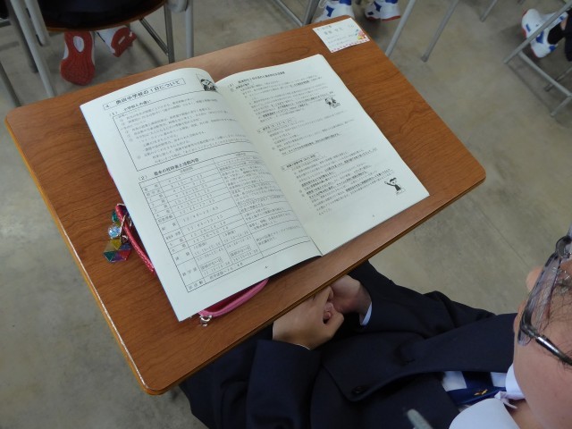 1組は、新入生のしおりを使って、1日の生活についての話を聞いてました。