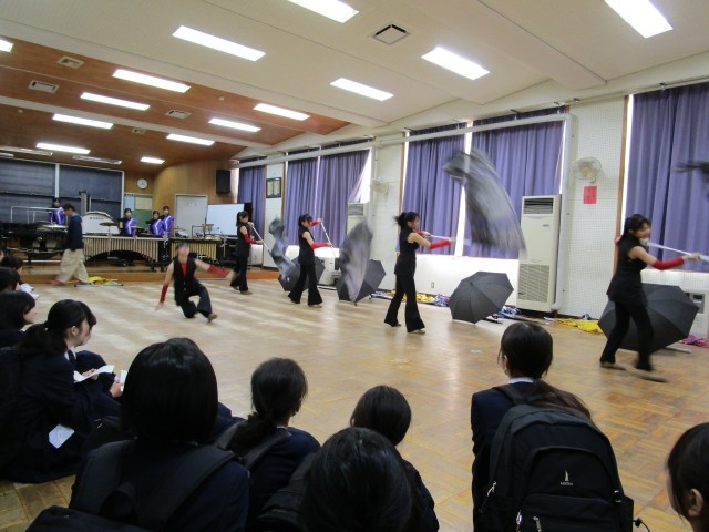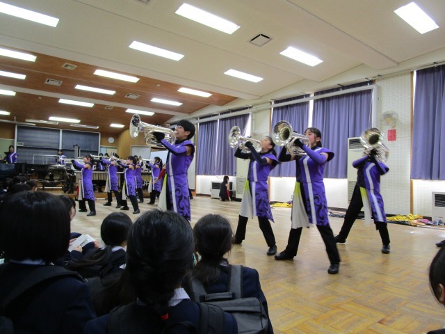 4月11日(金) 吹奏楽部 新入生向け演奏会 公開日 2025/04/12 更新日 2025/04/12 部活動 吹奏楽部も部活動見学に来た1年生に向けて、マーチングお披露目会を行いました。今日のために事前にお知らせプリントも配られました。見学には1年生のみならず、先輩たちも見に来ていました。躍動感のある豊かな表現力と迫力ある演奏に魅了され、予定にはなかった曲も追加公演されました。来週は外で行いますので、みなさん、是非是非見に来てください。