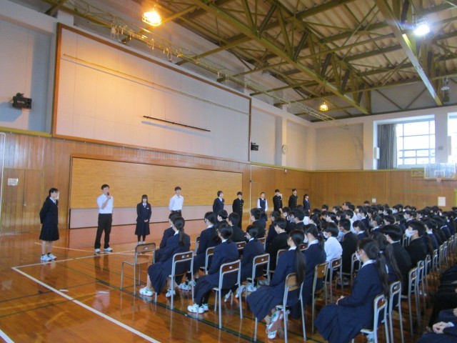 今日の6限は、学年集会でした。各学級の学級代表と学級目標の紹介をした後、学年目標の披露がありました。また先日、学級ごとに話し合った修学旅行の約束について、学年生徒会からの返答もありました。安全に秩序ある学習活動にできるよう、約束を守って楽しい修学旅行にしましょう。
