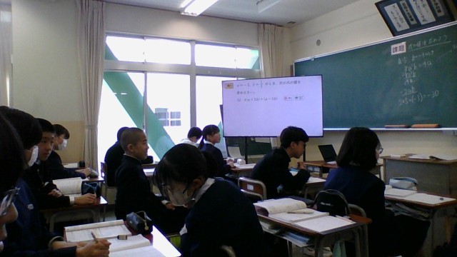5月1日(木) 2学年 授業の様子 公開日 2025/05/01 更新日 2025/05/01 2学年 4限写真 上:2年1組 国語 登場人物の心情曲線についてまとめています。 中:2年2組 下: 2年3組 両方の学級とも数学の問題に取り組んでいます。