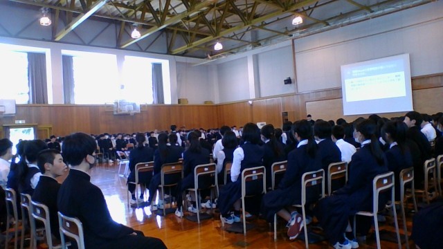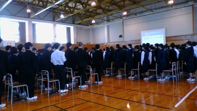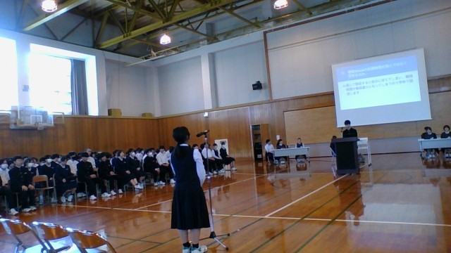 5月1日(木) 生徒総会 公開日 2025/05/02 更新日 2025/05/02 学校だより 5限体育館で「前期生徒総会」が開かれました。執行部、各委員会からスローガン、活動計画の提案が行われました。活動計画等へ質問や意見を発言する生徒と委員長のやりとりの後、全校生徒による採決が行われました。写真 上:生徒総会の様子 中:生活委員会の活動計画に質問する生徒 下:採決の様子。承認する生徒は起立します。賛成多数により可決しました。