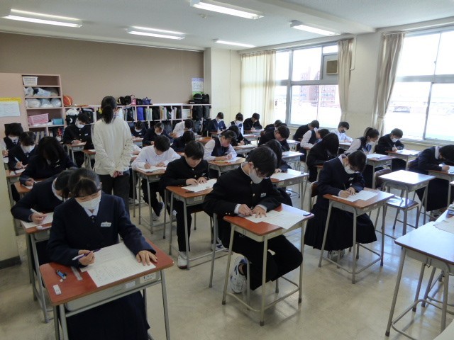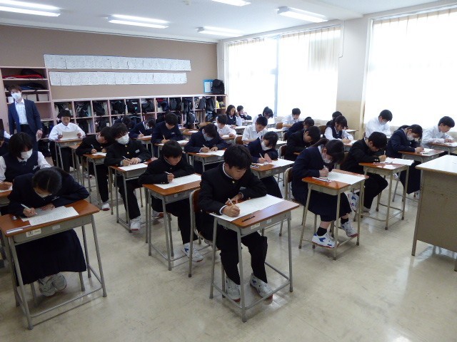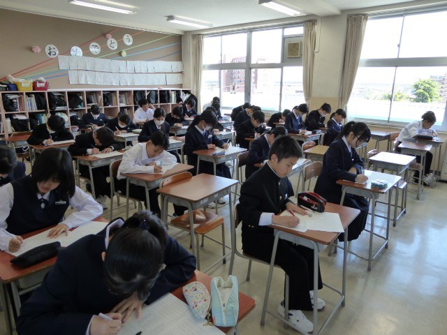 5月8日(木) 1学年 5限授業の様子 その2 公開日 2025/05/08 更新日 2025/05/08 1学年 4・5・6組の様子です。テスト開始後、すぐに名前を書きましょう。シャープペンシル1本と消しゴム1個という人がいました。落としたり、壊れたりしたときのために、鉛筆4~5本と消しゴム2個ぐらいあるといいですね。慣れていないのか、途中で物を落としてしまう人が多くいました。まず落とさないようにして、もし落としてしまったら自分で拾わず、監督者に取ってもらいましょう。