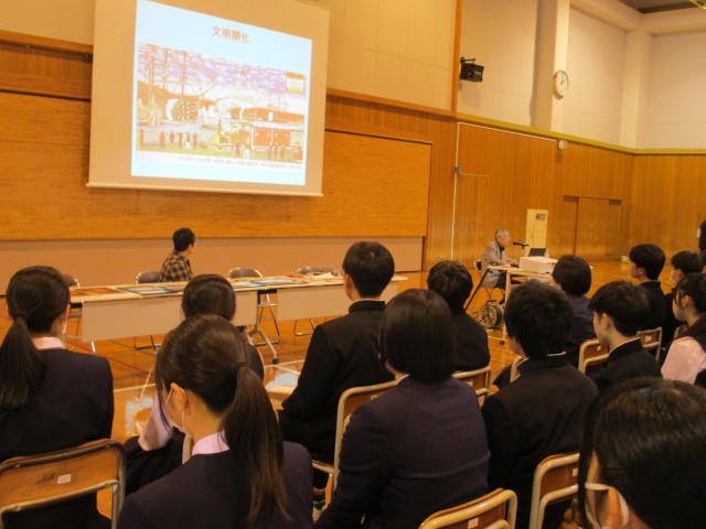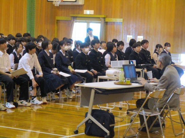 生徒は、配られたプリントを見たり、メモを取ったりしながら、お話を聴いていました。