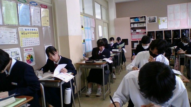 5月9日(金) 2年生 授業の様子 その1 公開日 2025/05/09 更新日 2025/05/09 2学年 5限2年生の授業の様子を紹介します。写真 上:2年1組 保健体育 日差しに負けずに頑張っています。 中:2年2組 社会 グループ、ペア、個人でノート作成中。 下:2年3組 理科 プリントの問題に取り組んでいます。