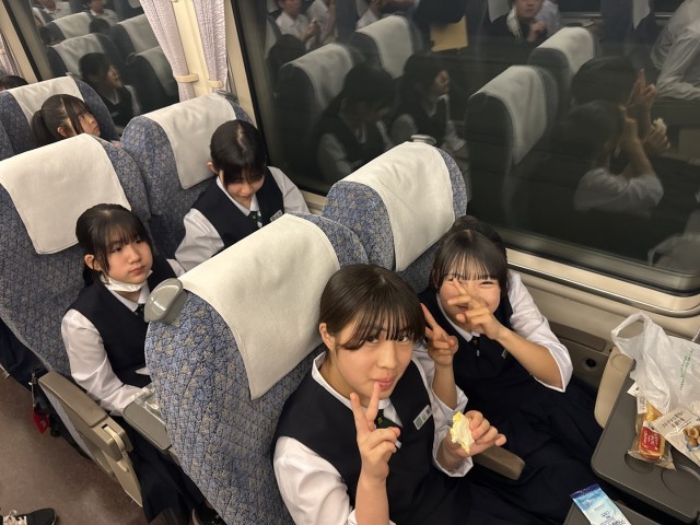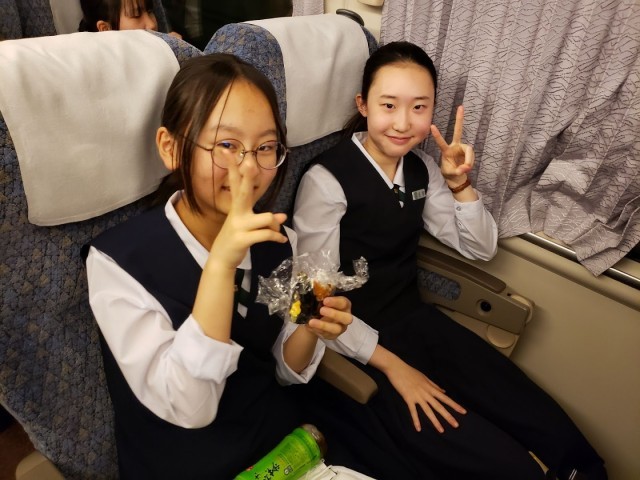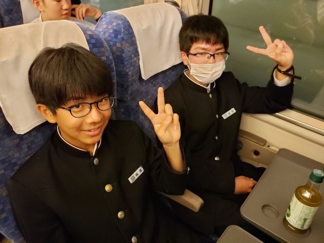 敦賀発サンダーバードで軽食を食べています。京都班別学習に向けてエネルギー補給万全です!