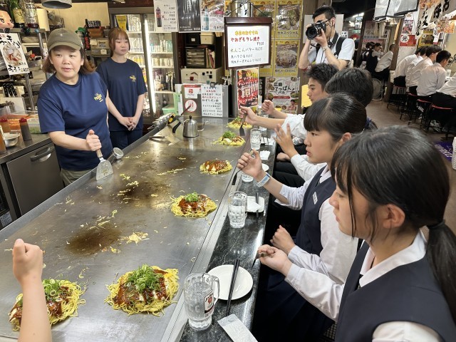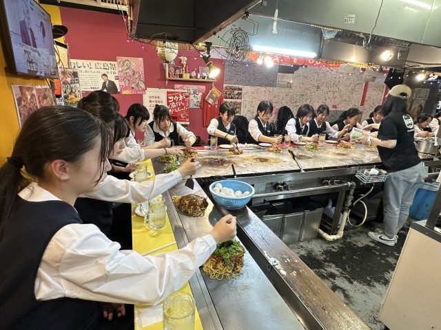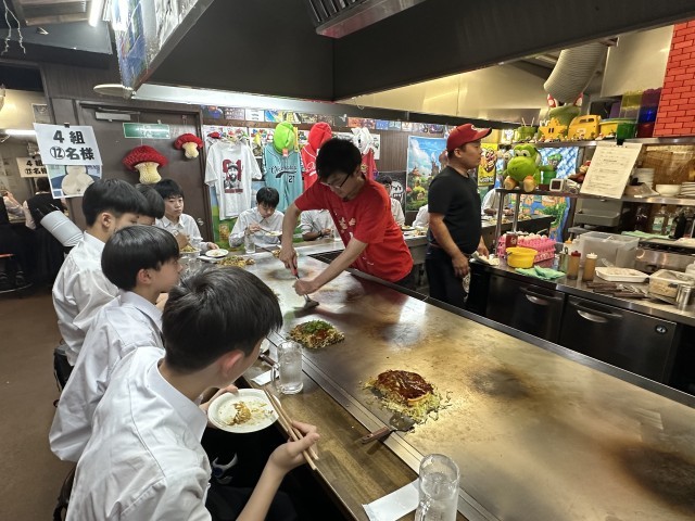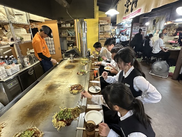 5月15日(木)修学旅行2日目 13 公開日 2025/05/15 更新日 2025/05/15 3学年 2日目の夕食は本場広島のお好み焼き。本日は一番基本の「豚玉焼きそば焼き」。店員さんに焼いてもらった後、食べ方のレクチャーを受けたり、大阪のものとの違いを教えていただいたりしながら、美味しくいただきました。 +1