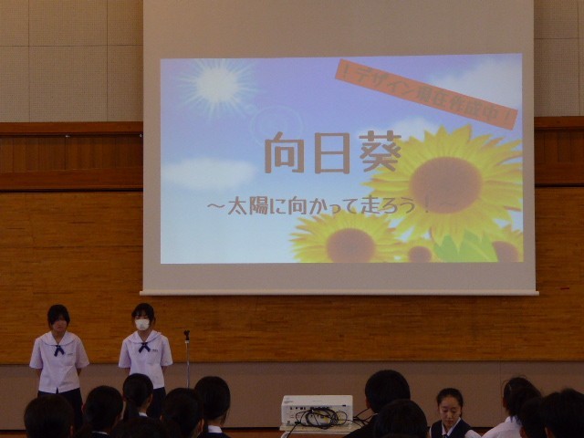 また、1年生を担当する教育実習生の紹介し、集会の終わりに、生活指導担当から衣替えの時期や期間は特に定められていないので、自分の体調や気候に合わせて適切な制服を着用することや、靴下等について気を付けることを話しました。
