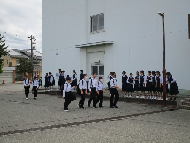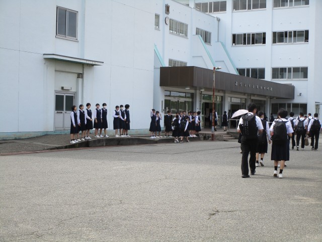 生徒玄関の前で、女子バスケットボール部が元気に「部活動挨拶リレー」に参加していました。