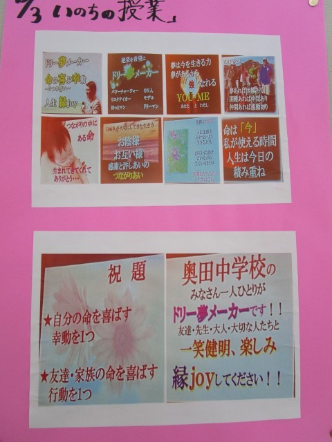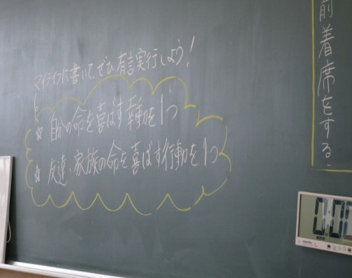 昨日の「命の授業」での祝題(宿題)を実行できるように、学びをいつでも振り返ることができるようにと掲示物があったり、黒板での呼び掛けが見られたりしました。