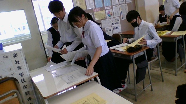 6月4日(水) 2学年 14歳の挑戦にむけて 公開日 2025/06/05 更新日 2025/06/05 2学年 朝学活各学級で「社会に学ぶ『14歳の挑戦』」で使用する「しおり」を作成しました。写真 しおりを組む様子