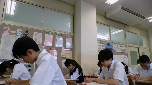 6月25日(水) 2学年 1学期末考査 その1 公開日 2025/06/25 更新日 2025/06/25 2学年 1限1学期末考査最終日。最後まで気を抜かずに問題に挑みます。写真(国語の受検の様子 枕草子に関して出題されました)