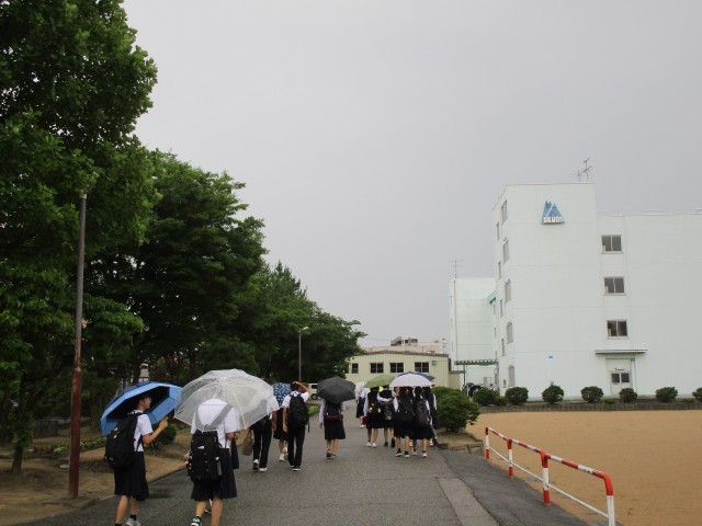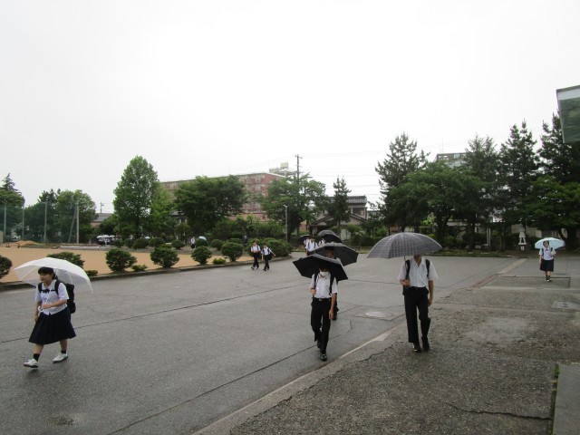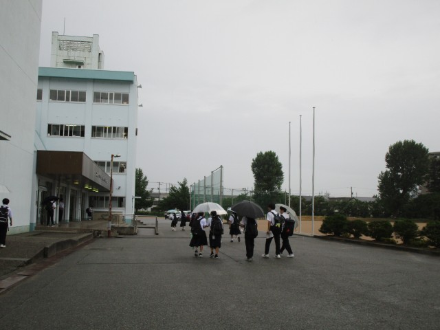 6月25日(水) 登校の様子 公開日 2025/06/25 更新日 2025/06/25 学校だより 小雨だった雨が、途中から強まってきました。 2~3人で一つの傘に入って登校する生徒、走って玄関に駆け込む生徒、傘をさしてゆっくり登校する生徒、様々です。 1学期考査3日目、最終日です。 4限に第2回避難訓練を行います。