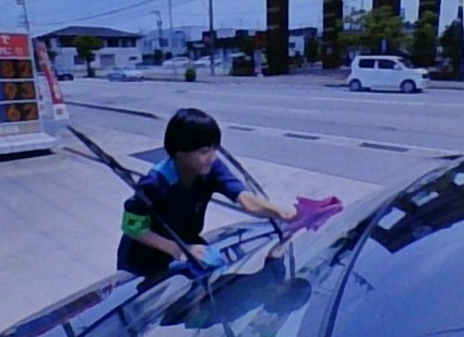 目を輝かせながらフロントガラスを磨きます。