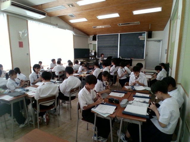 7月8日(火) 1年生1限の授業 その1 公開日 2025/07/09 更新日 2025/07/09 1学年 1組は、保健体育でバレーボールをしていました。2組は、理科でした。3組は、音楽でリコーダーの練習をしていました。