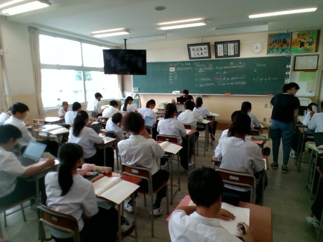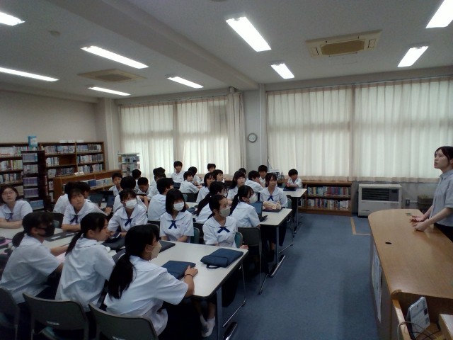 7月10日(木) 1年生1限の授業 その1 公開日 2025/07/10 更新日 2025/07/10 1学年 6組は、図書室で「本のポップを作ろう」という国語の授業でした。2組は、保健体育でバレーボールをしていました。4組は、英語で「When」を使った文を考えていました。