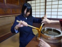 薬剤師さんによる薬を飲む実験の様子。写真 上:薬を水で飲むと透明な色。 中:...