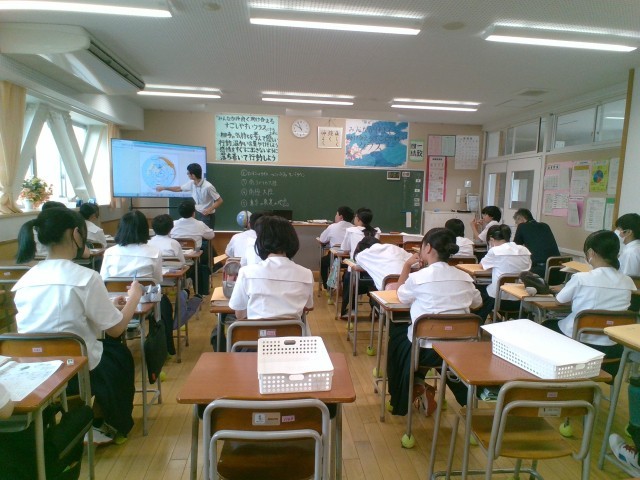1年生の社会です。今日は地球儀を見ながら、地理を学習しています。