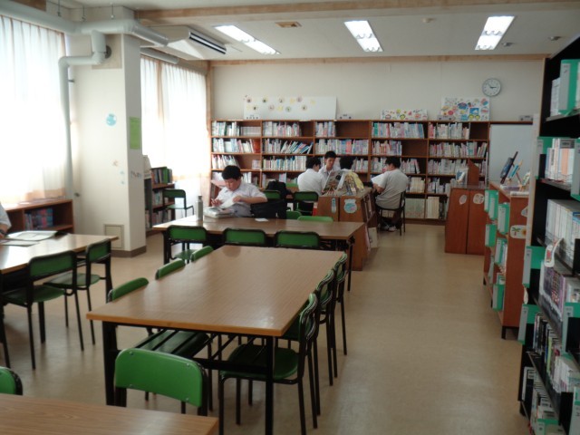 放課後の図書室です。本を読んでいる人や学習している人がいます。部活動がない3年生は、教えあいながら学習しています。図書支援員の皆様いつもありがとうございます。