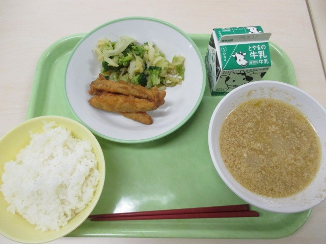 今日のメニューは、ごはん、牛乳、わかさぎのフリッター、ブロッコリーの和え物、坦々春雨スープです。