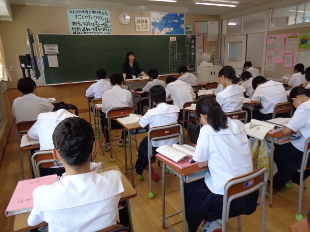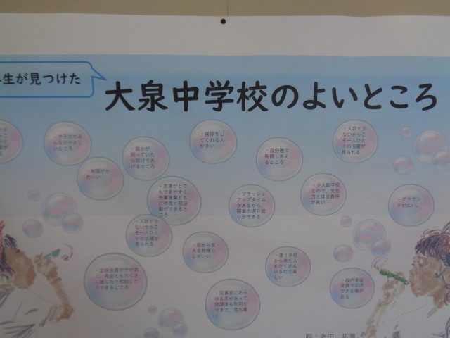 1年生の国語です。落ち着いて授業に取り組んでいます。今週末の学校統一公開日に向けて、廊下には「大泉中学校のよいところ」が掲示されていました。1年生が入学して感じたことをまとめています。来校の折にご覧ください。