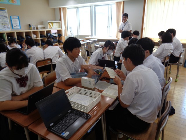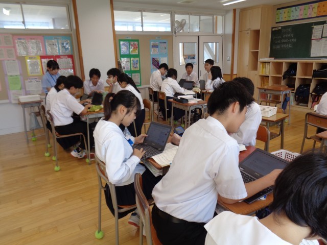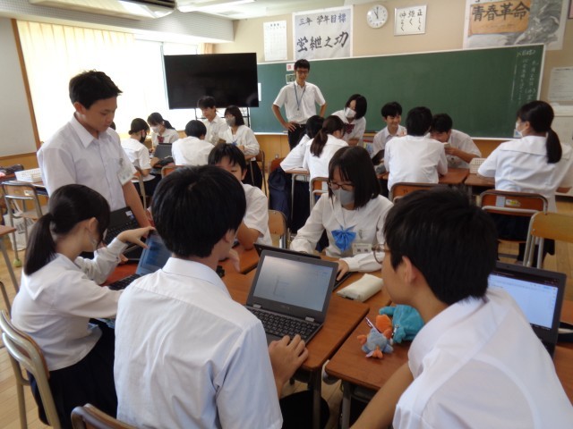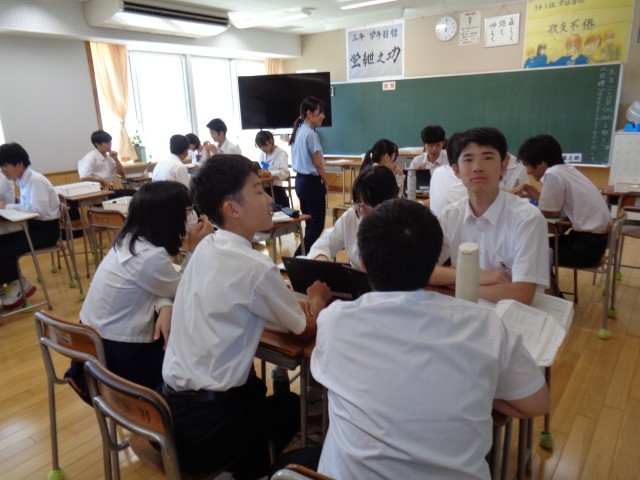 3年生の授業です。文化活動発表会の各教室の合唱コンクールのスローガンを考えています。