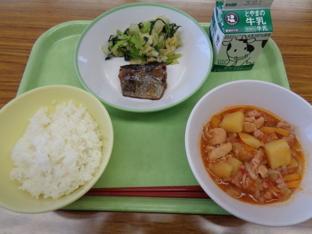 メニューは、ごはん、牛乳、にしんの照り煮、しょうがひたし、トマト肉じゃがでした。おいしくいただきました。