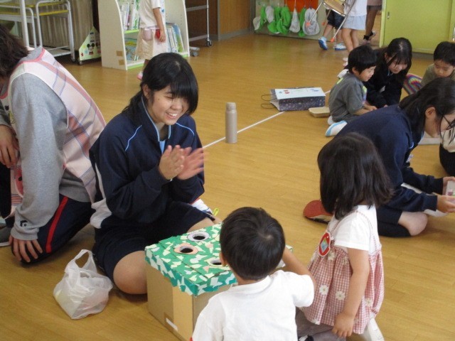技術・家庭科の授業の一環として「保育所訪問」を「行いました。今回も、昨年度同様清水保育所の方々に協力していただき、訪問させていただきました。生徒は夏休みに製作した手作りのおもちゃを持参し、園児のみなさんと楽しく遊びました。無邪気な子供たちの笑顔に、中学生も終始にこにこの笑顔でした。*製作したおもちゃは10月25日に本校で行われる「文化活動発表会」で展示します。是非、ご覧ください。