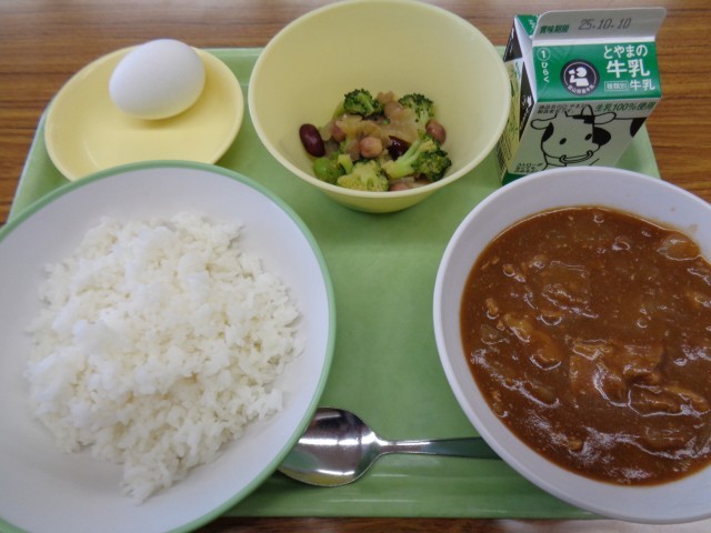 メニューはごはん、牛乳、ハヤシライス、ゆで卵、ビーンズサラダでした。おいしくいただきました。