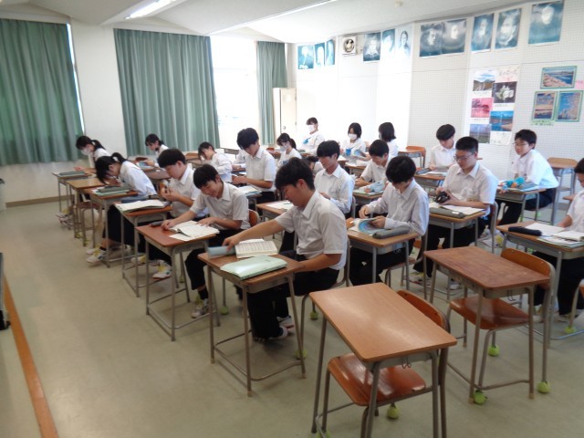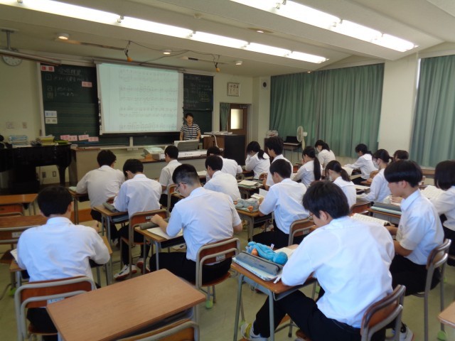 3年生の社会と音楽です。音楽では、合唱コンクールに向けて練習をしています。楽譜に書いてある記号の意味を確認していました。