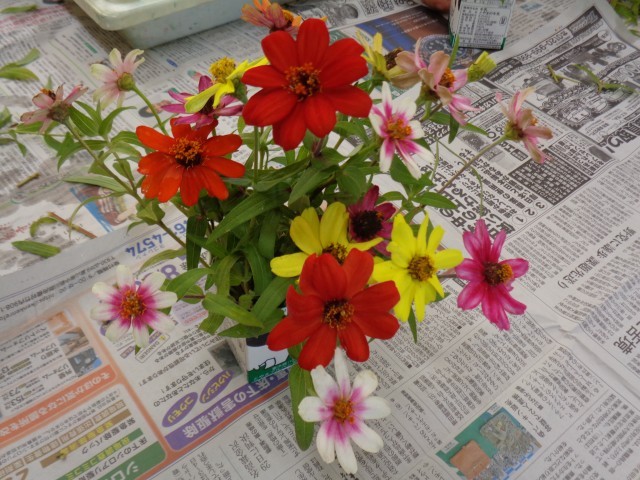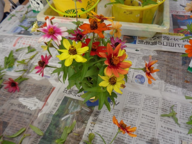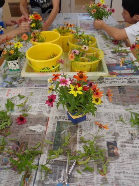 いずみ級の様子です。学校花壇の花を使って、かわいいアレンジメントをしていました。家族に届けるのを楽しみにしています。