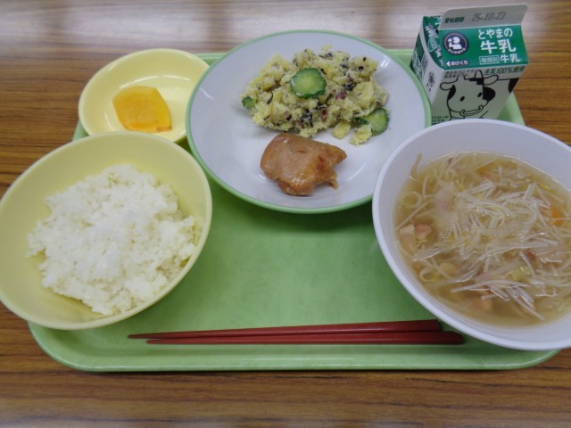 メニューは、ごはん、牛乳、照り焼きチキン、さつまいもとひじきのサラダ、ビーフンスープ、柿でした。おいしくいただきました。