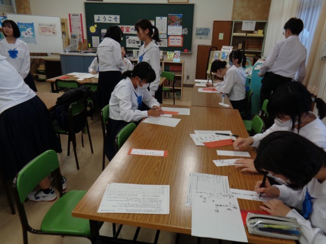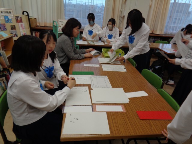 放課後の図書室です。文化活動発表会で展示する短歌や俳句を、筆ペンで書き掲示できるように台紙に貼っていました。ぜひ当日展示をご覧ください。