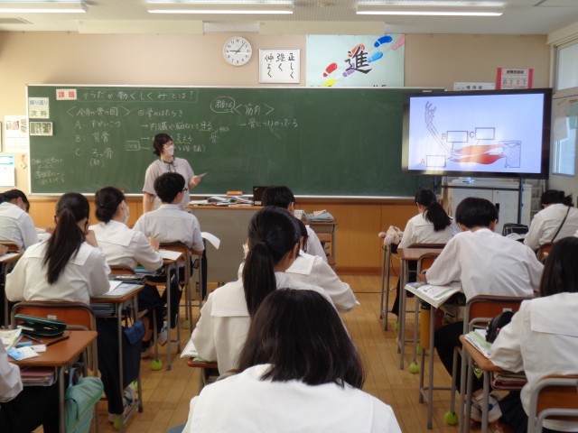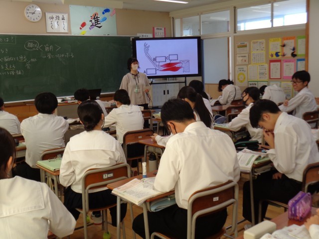 2年生の理科です。からだの仕組みについて学習しています。自分の筋肉を確認しています。