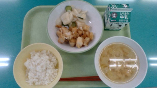 今日の給食は、ごはん、牛乳、ホキとじゃがいもの甘からめ、かぶの色どり、みそ汁です。