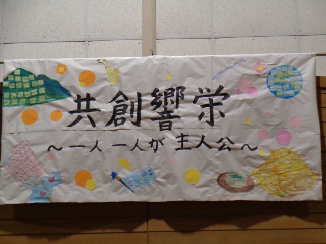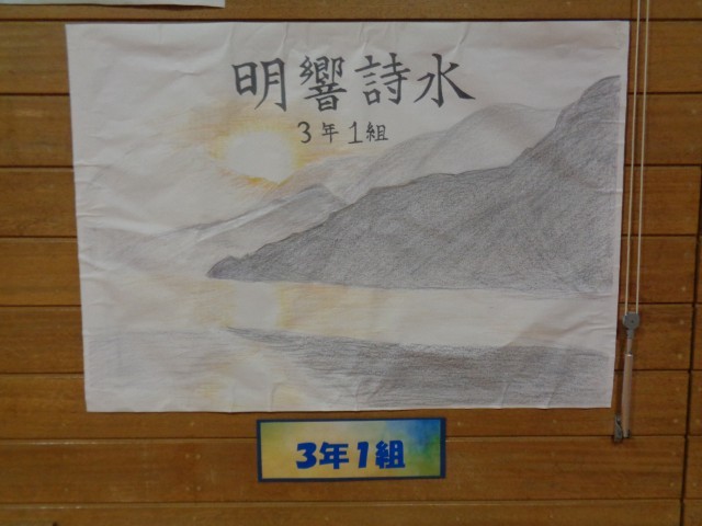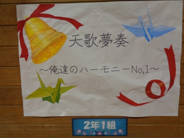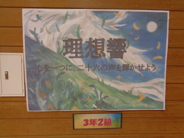 体育館に掲示された各学級の合唱コンクールスローガンと文化活動発表会のスローガンです。