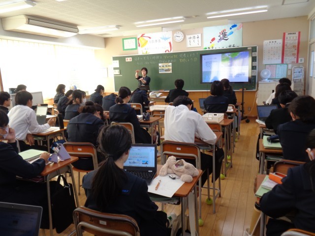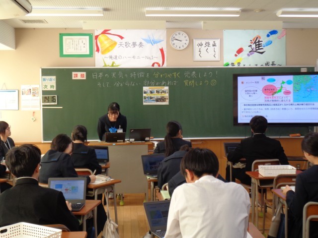 2年生の理科です。日本の天気の特徴を調べて発表していました。